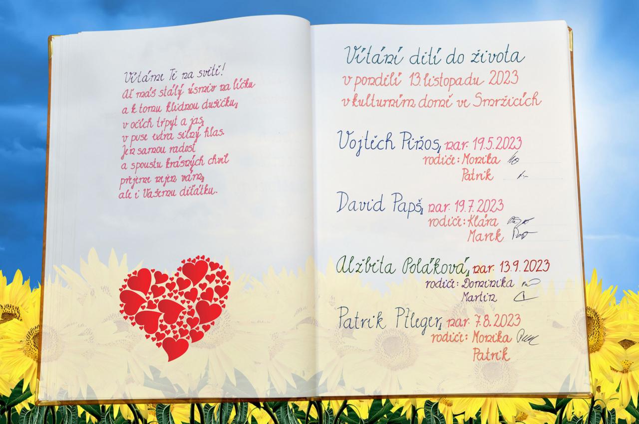 V pondělí 13. listopadu byli přivítáni do života čtyři noví občánci Smržic - tři kluci a jedna holčička. Kvůli opravě obřadní síně se termín vítání odkládal. Oprava se ale protáhla a noví občánci byli nakonec přivítáni na sále kulturního domu. V úvodu všem zazpívaly děti z mateřské školy. Nové občánky představila matrikářka Radka Odvářková a následoval proslov místostarosty obce Jiřího Peky. Rodiče se postupně podepsali do pamětní knihy a předány jim byly dárečky a finanční příspěvek obce.